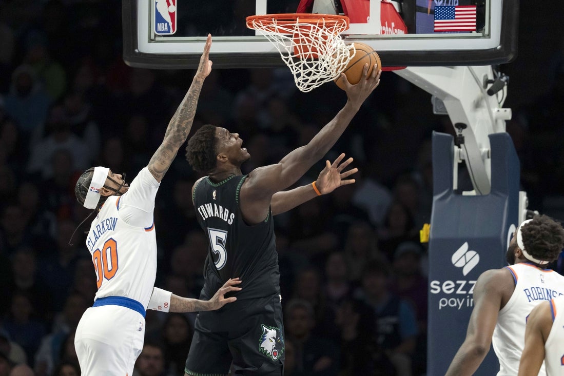 Anthony Edwards scored 38 points and Julius Randle logged 17 of his 25 in the fourth quarter as the Minnesota Timberwolves took down the New York Knicks 115-104 on Tuesday in Minneapolis.