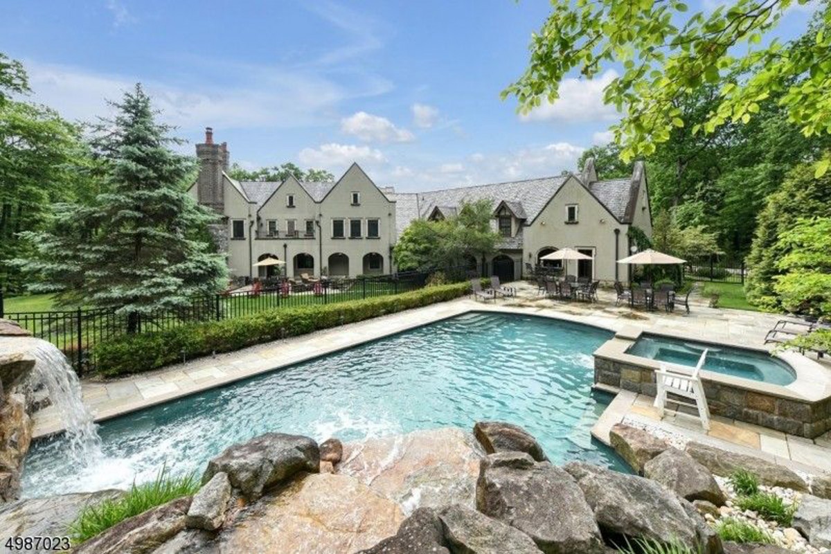 The seven-bedroom, seven-bathroom, three-powder-room house is a gated, grey stone mansion spanning about 7,000 sq. ft