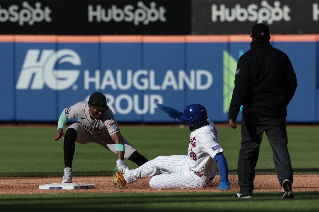 Alvarez walked with two outs in the second. Lindor followed by doubling over the glove of Corbin Carroll in right field, and Alvarez raced home when Carroll’s throw skipped past second baseman Ketel Marte and dribbled into the infield.