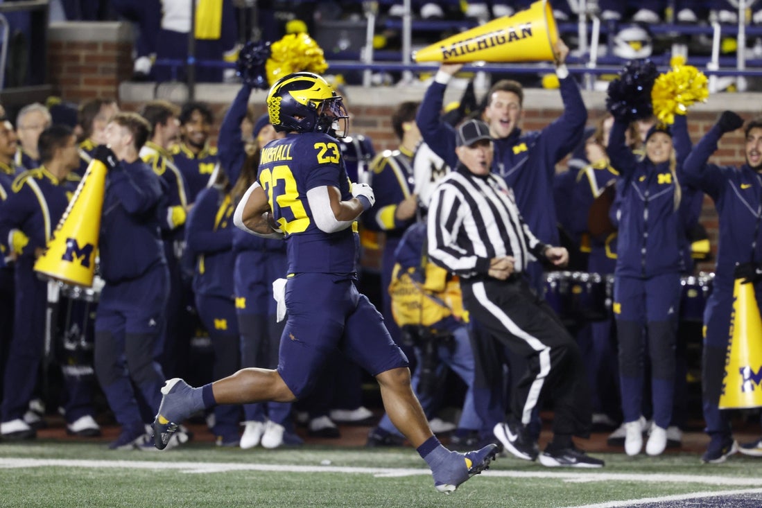 Freshman Bryce Underwood throws for 185.7 yards per game with seven touchdowns and three picks. Donavan McCulley has 26 catches for 383 yards and Andrew Marsh 25 for 376 yards.