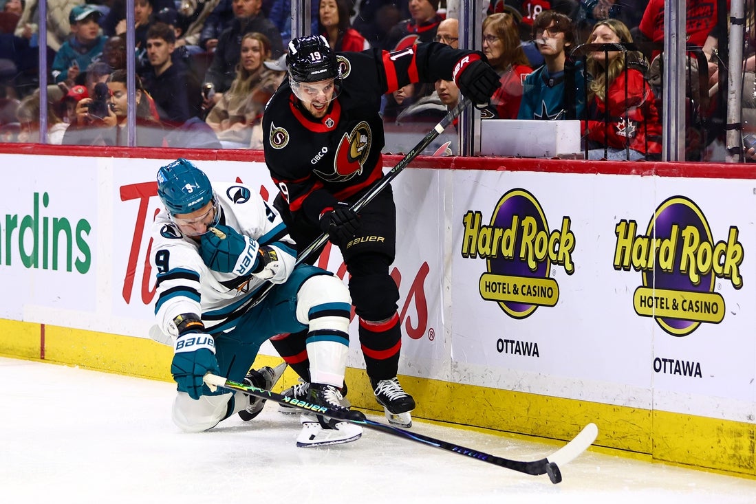 Drake Batherson scored twice, including the go-ahead goal in the third period, in a 7-4 win for the Ottawa Senators against the visiting San Jose Sharks on Sunday.