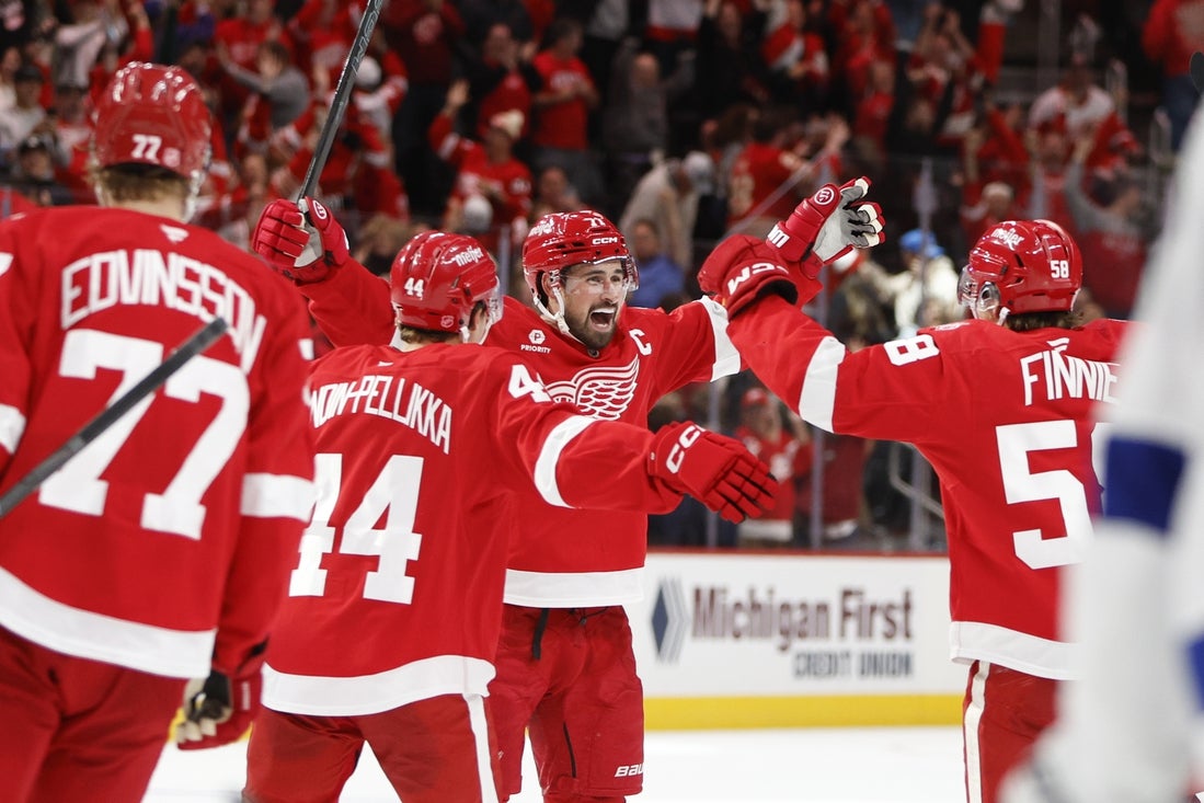 Axel Sandin-Pellikka scored his first career goal during the first period. Larkin assisted on the rookie’s first-period marker and has contributed at least one point in all of the Red Wings’ five games this season.