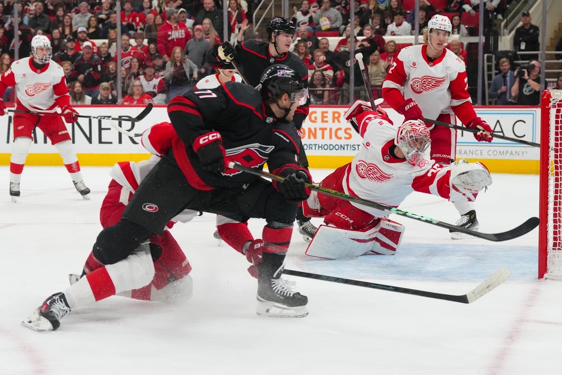Carolina posted a 15-5 advantage in first-period shots, but the Red Wings had only their 22nd first-period goal of the season.