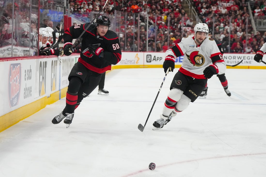 The pace was much accelerated from Game 1, with the Hurricanes holding a 28-16 edge in shots through two periods. The Senators outshot Carolina 8-5 in the scoreless third, which was played without a penalty called.