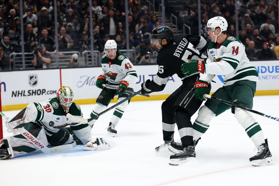 Perry’s goal came when a Byfield shot deflected off his wrist while on a power play. Byfield was credited with his own goal when the puck went across the line off a Wild stick. It was the kind of good fortune Los Angeles has been looking for.