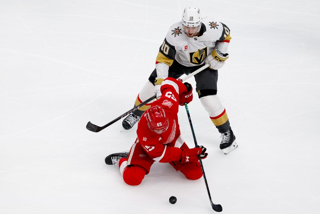 Tomas Hertl scored a 4-on-3 power-play goal 2:11 into overtime as the visiting Vegas Golden Knights rallied from a two-goal third-period deficit to defeat the Detroit Red Wings 4-3 on Wednesday.