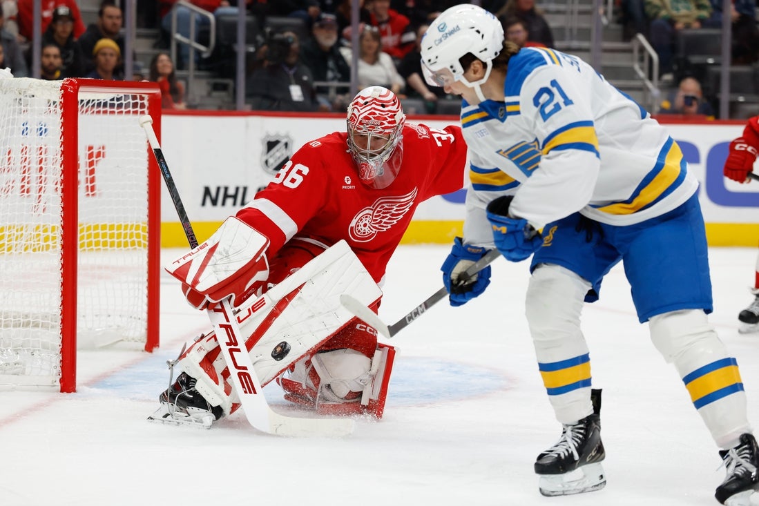 Detroit scored twice in the final 1:26 of the period to pull within a goal. Finnie scored in front off a Dylan Larkin pass that bounced off Faulk’s stick. Compher then redirected a Travis Hamonic shot.