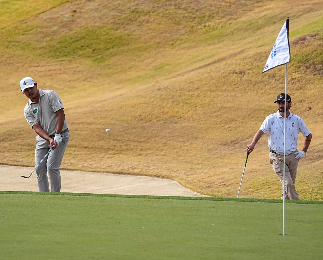 Kim’s round at LaQuinta Country Club included seven birdies with a bogey as he bids for his second championship in the tournament, which he won in 2021. He rolled in three straight birdie putts on his back nine.