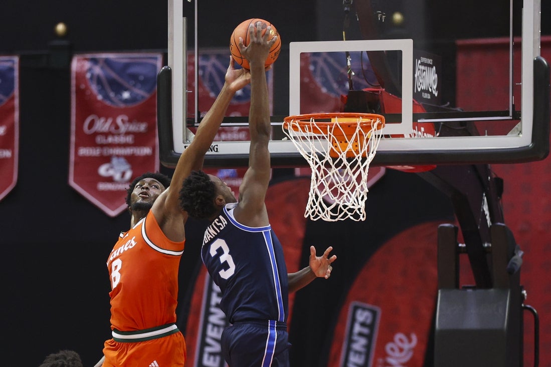 Ernest Udeh Jr. returned to Miami’s lineup after missing the previous two games with a lower-body injury. He finished with six points and eight rebounds before fouling out with 1:12 remaining in the game.