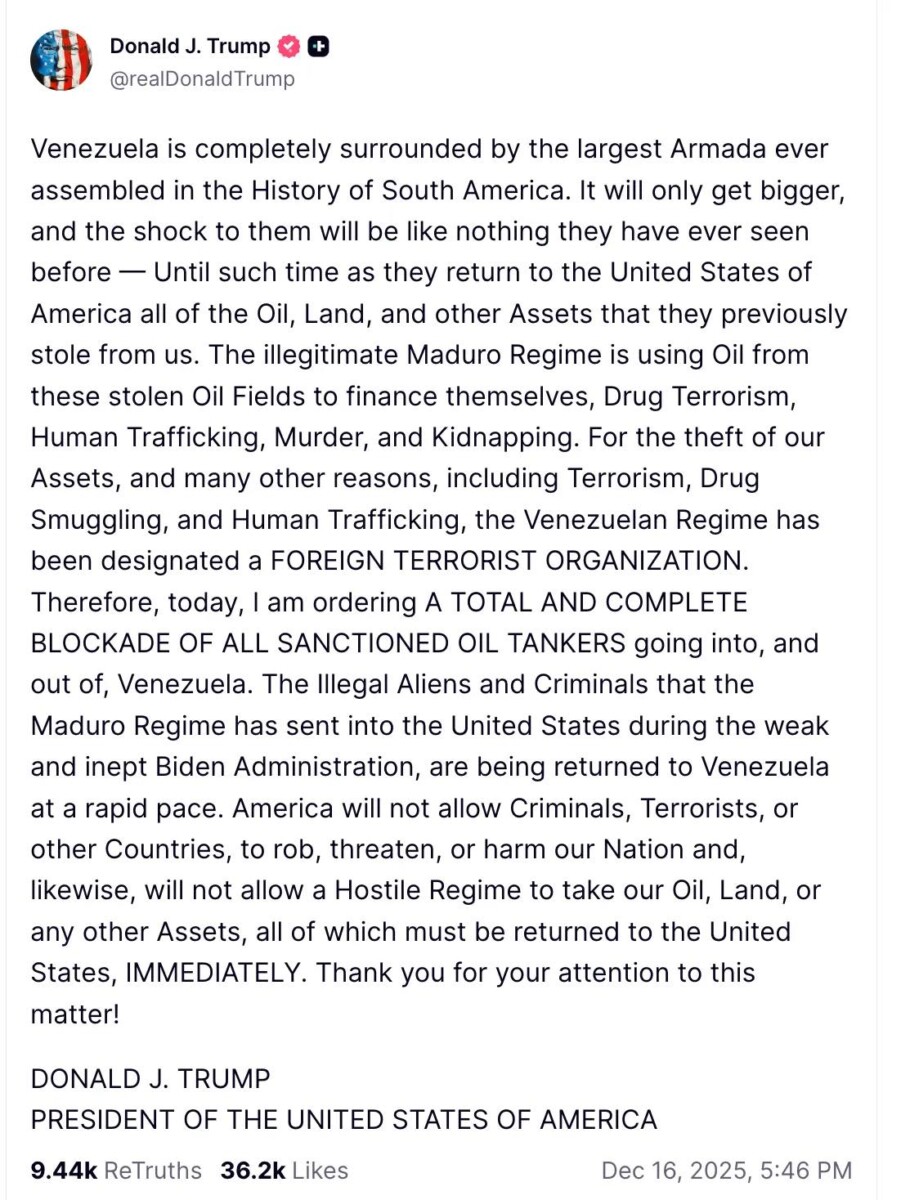 President Donald Trump has recently ordered a total blockade of oil tankers that are heading to or leaving Venezuela. He has also labeled the country as a “foreign terrorist organization’.” He also demanded the return of oil, land, and other assets that the country had stolen from the US.